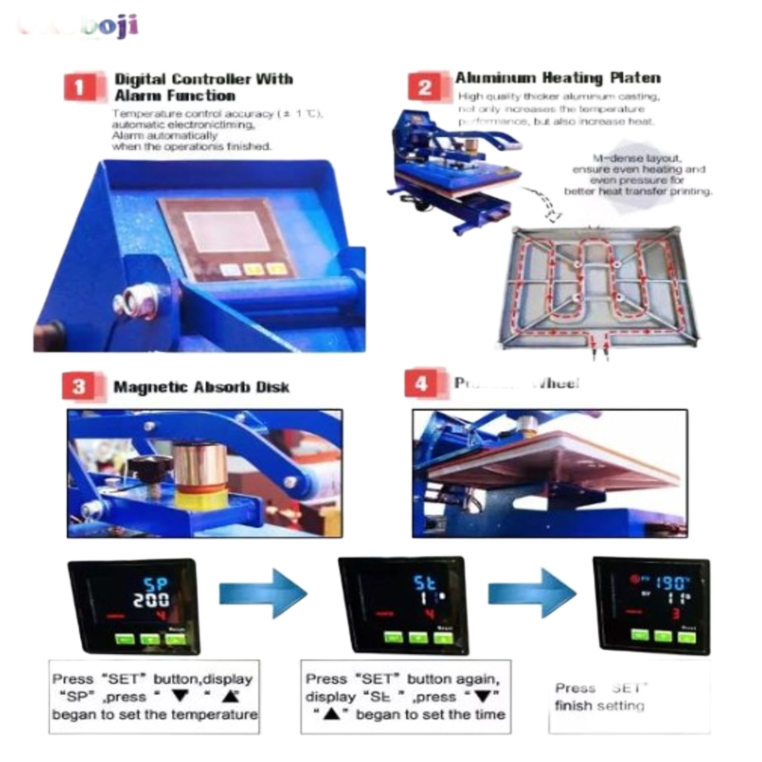 - Advanced aluminum heating plate technology with 2200W power ensures rapid heating and even temperature distribution for professional results on large-format applications