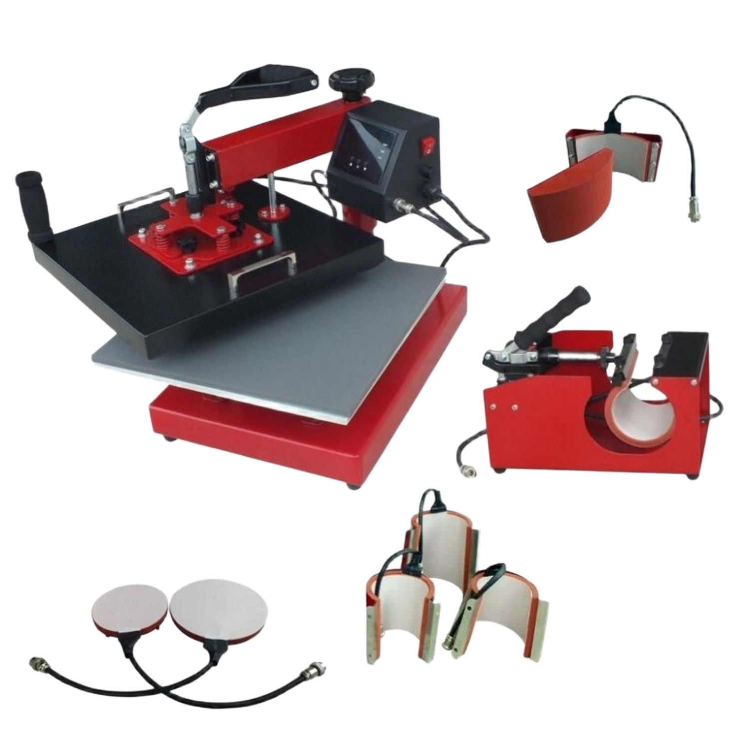 The standard package includes all essential heaters for mugs (multiple sizes), plates, and caps, providing immediate capability to serve the most popular sublimation product categories in the Indian market.